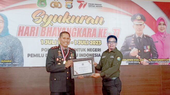 SIDRAP.FRONTSULSEL.COM– Pengurus Daerah Ikatan Wartawan Online (PD-IWO) Kabupaten Sidrap memberikan penghargaan istimewa kepada Kapolres Sidrap, AKBP Erwin Syah SIK dan jajarannya atas kontribusi dan dedikasi yang luar biasa dalam menjalankan tugas kepolisian. Penghargaan berupa sertifikat kemitraan tersebut diserahkan secara langsung oleh Ketua PD-IWO Sidrap, Edy Basri., S.H, pada acara Puncak Hari Bhayangkara ke-77 yang diadakan di Kantor Satuan Kerja Perangkat Daerah (SKPD) Sidrap pada Sabtu, 1 Juli 2023.