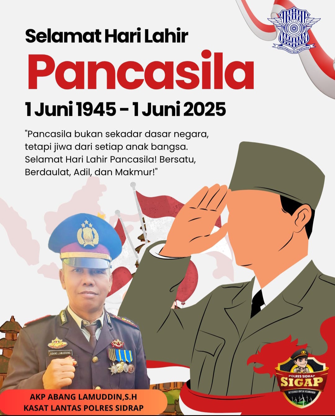 SIDRAP.FRONTSULSEL.COM – Dalam momentum peringatan Hari Lahir Pancasila yang jatuh pada 1 Juni, Kasat Lantas Polres Sidrap, AKP Abang Lamuddin, S.H., menyampaikan ucapan penuh semangat dan makna bagi seluruh masyarakat Sidrap.